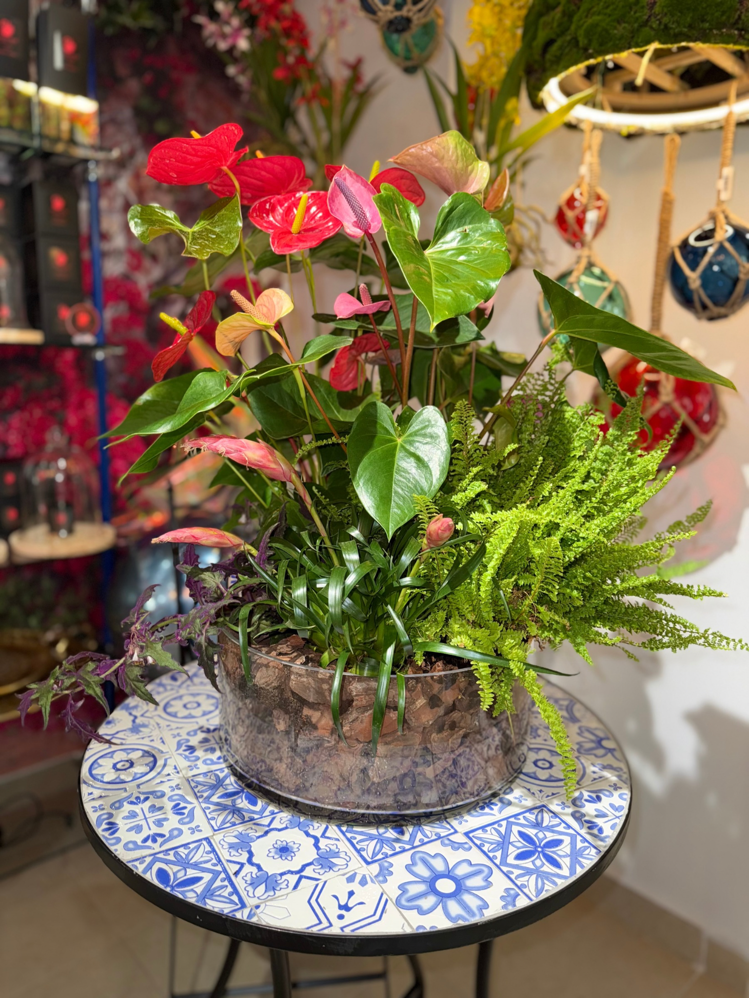 Composición de plantas en base grande de cristal