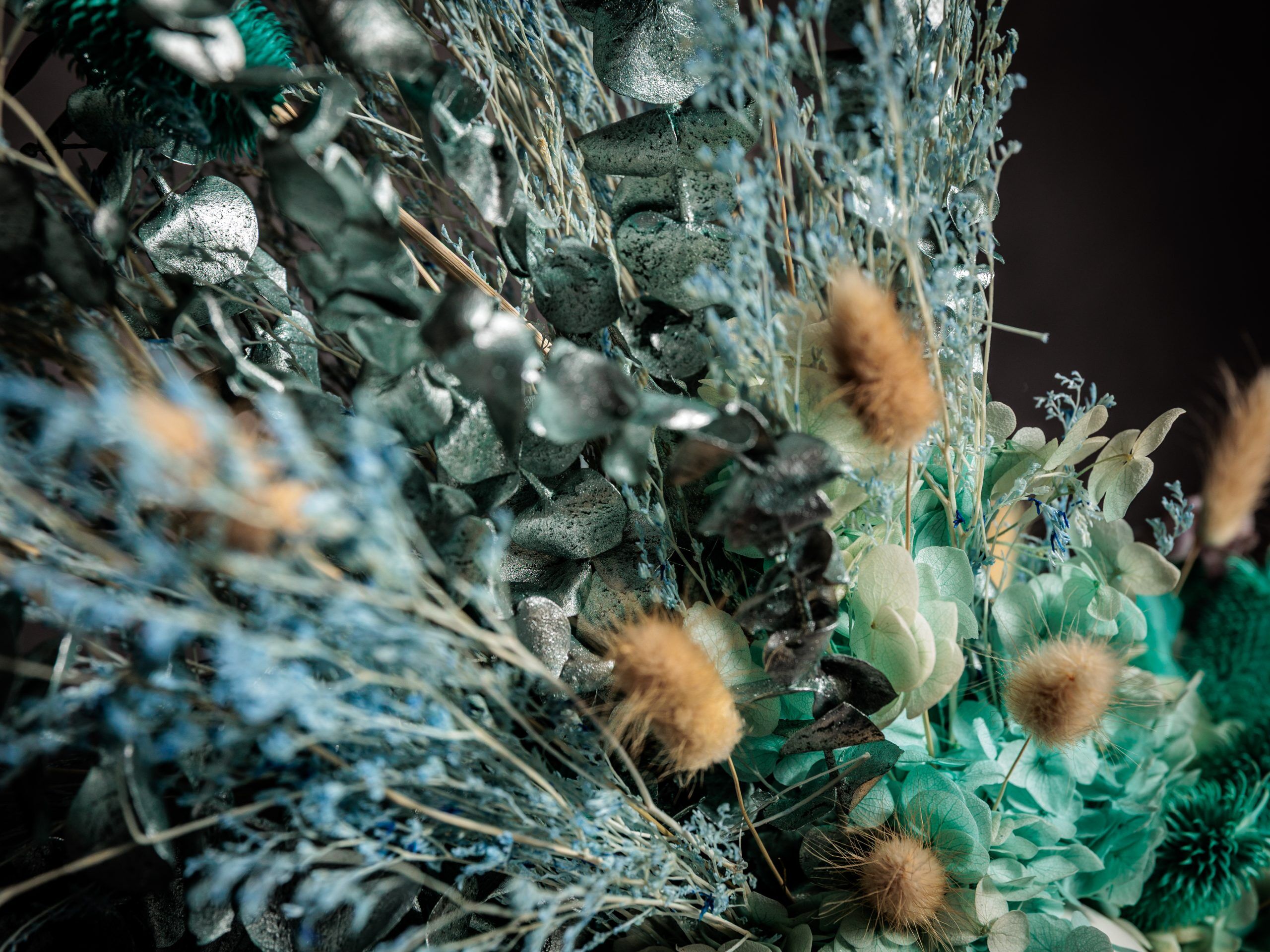 En su interior, descansa un exquisito arreglo de flores preservadas en color turquesa, cuidadosamente seleccionadas para crear una armonía visual en distintas tonalidades: desde suaves aqua y verde mar, hasta profundos tonos océano y esmeralda. Cada flor ha sido tratada para conservar su belleza natural por largo tiempo, sin necesidad de agua ni mantenimiento.