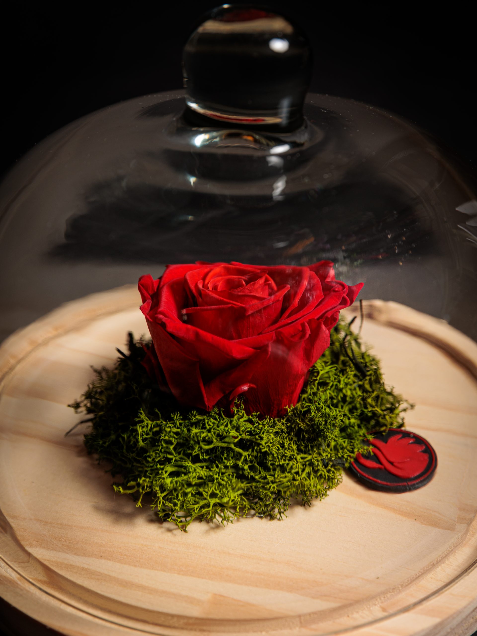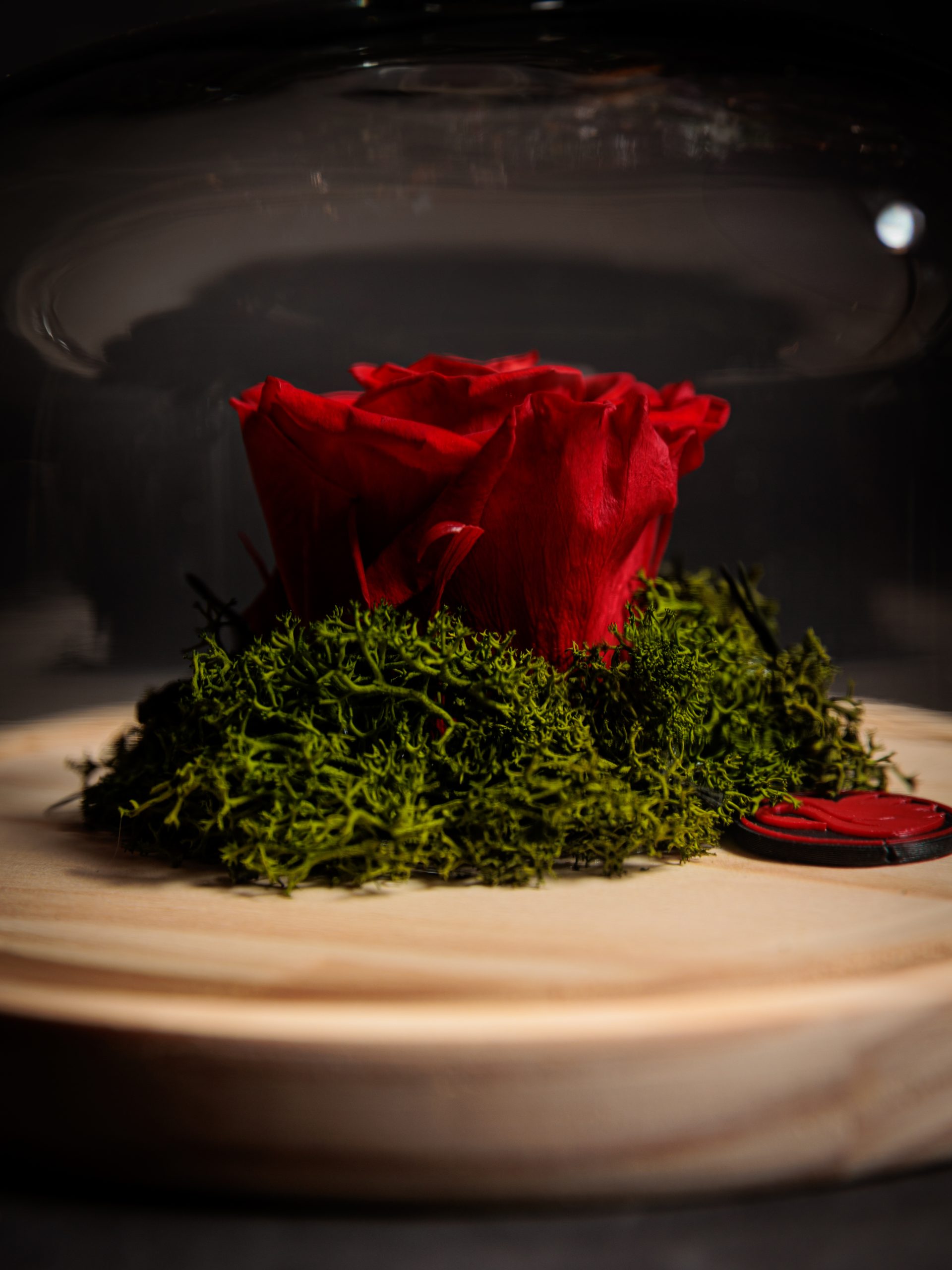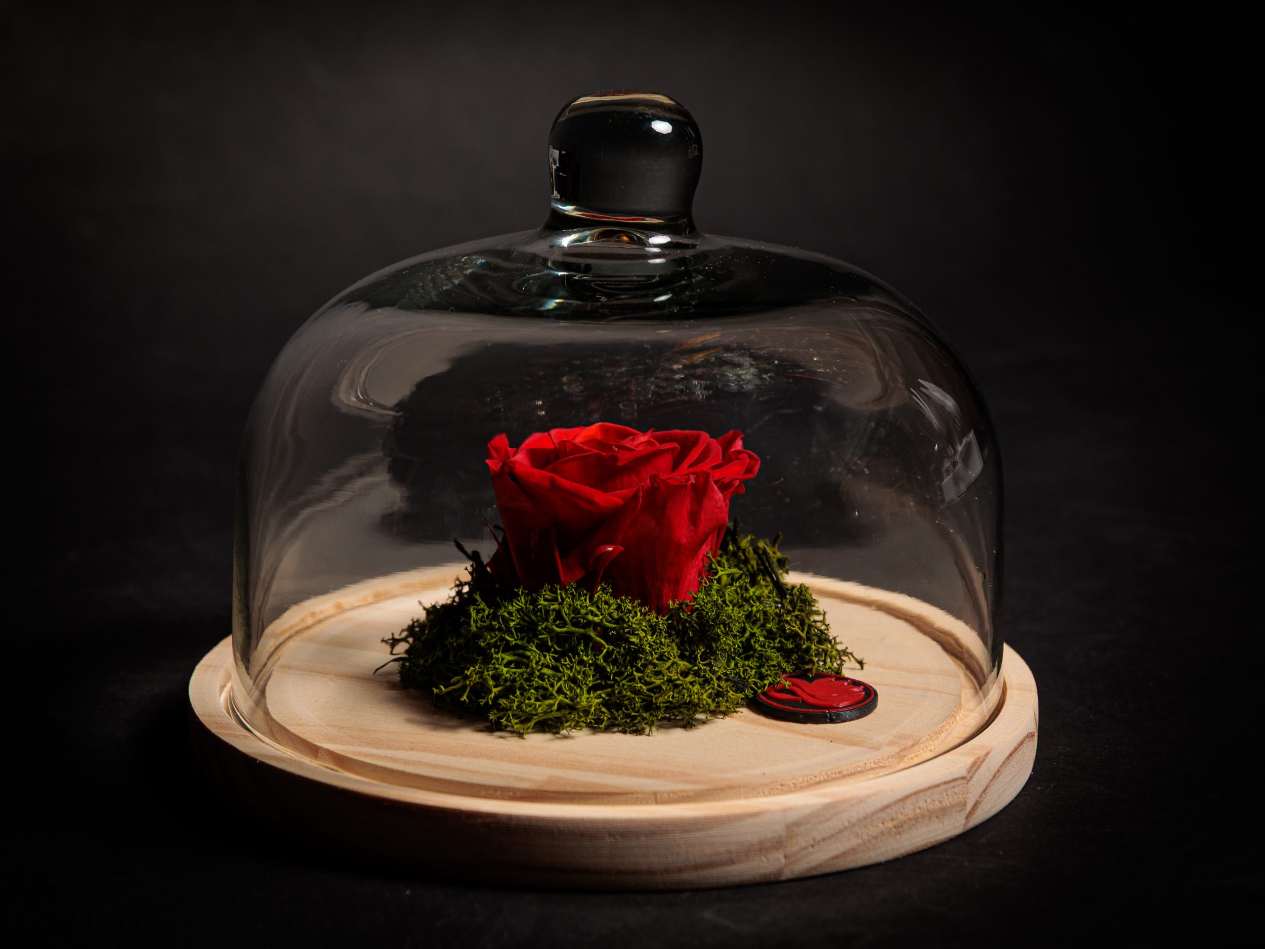 Cúpula de cristal con rosas preservada en base de musgo natural….