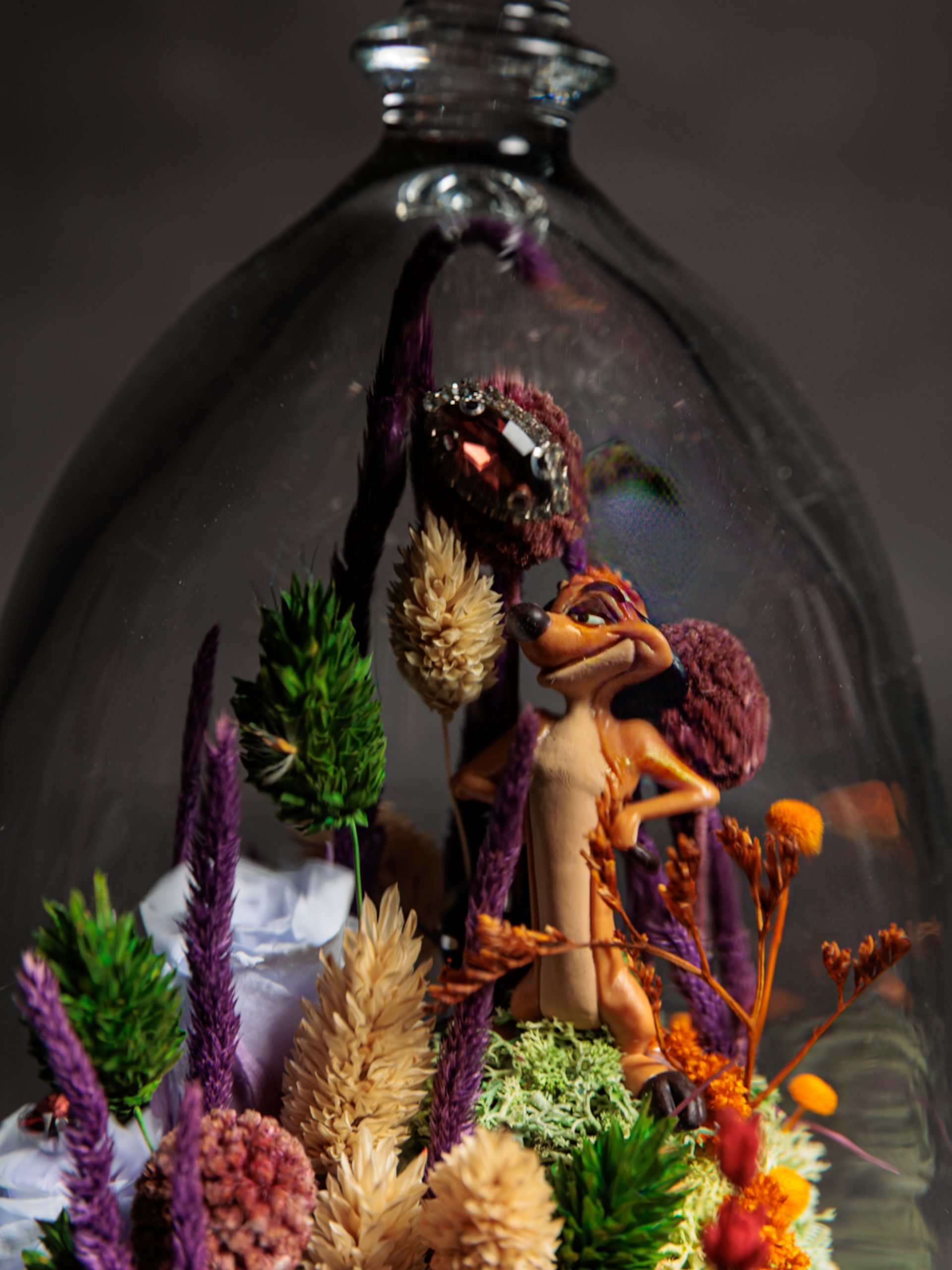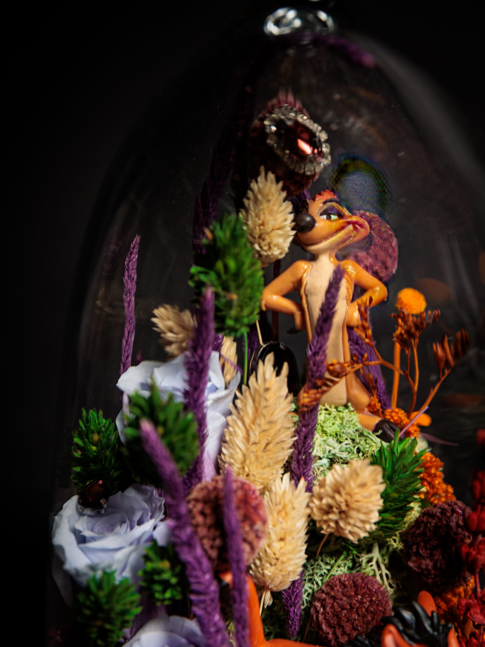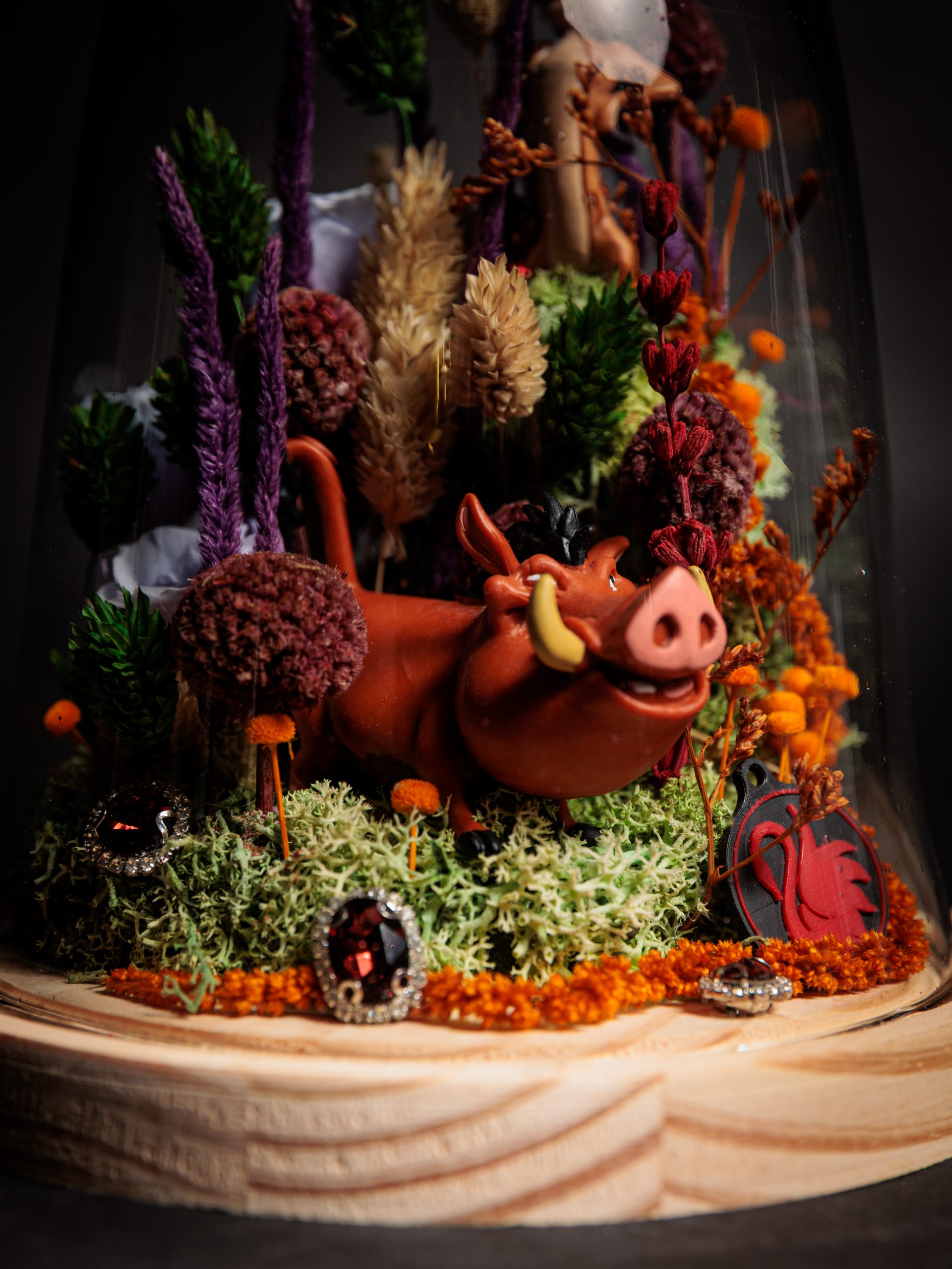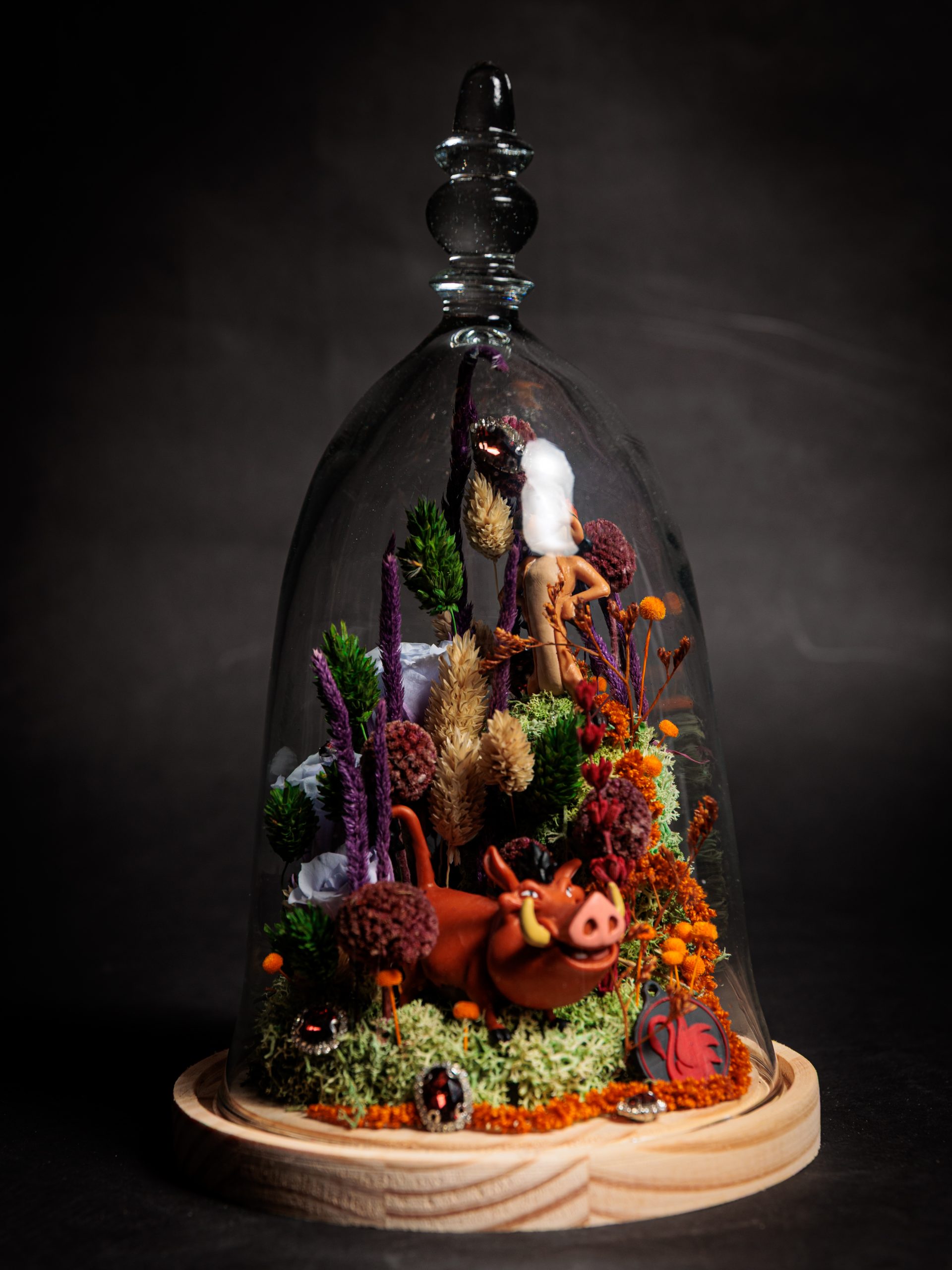 Cúpula de cristal con temática de Timón & Puma , Un jardín de flores naturales preservadas, creando una pieza de coleccionista única.